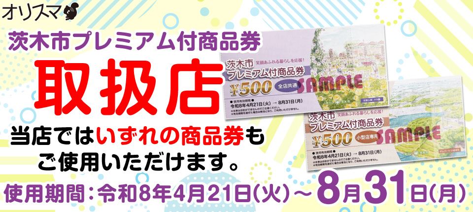 当店にて「茨木市プレミアム付商品券」がご利用いただけます。